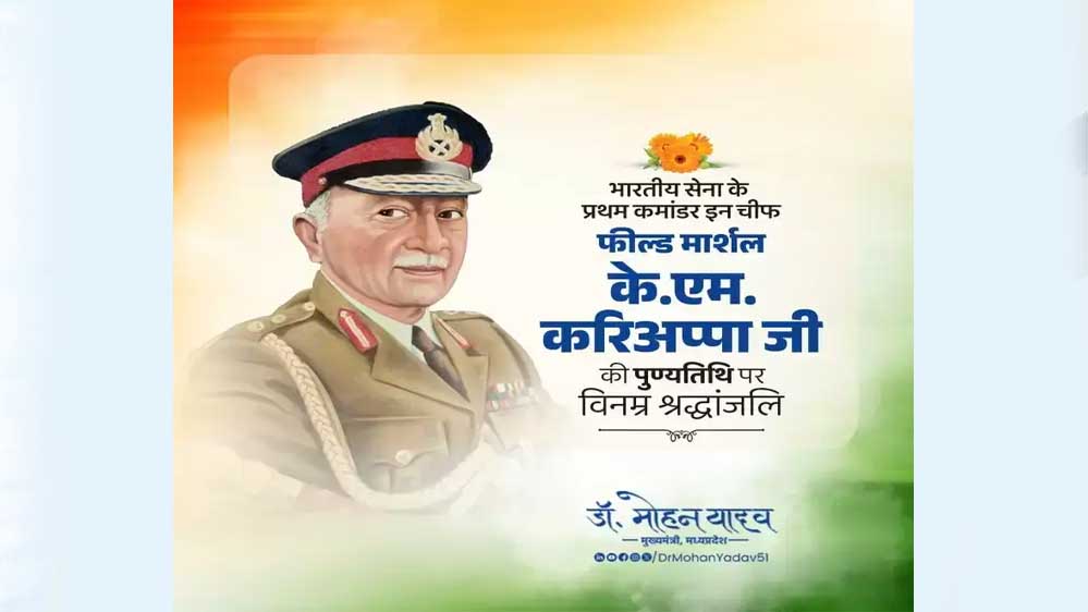 मुख्यमंत्री डॉ. यादव ने सोशल मीडिया ‘एक्स’ पर फील्ड मार्शल करिअप्पा के राष्ट्र निर्माण में योगदान को नमन करते हुए कहा कि स्वतंत्र भारत को सशक्त बनाने और सेना की सुदृढ़ता के लिए किए गए उनके प्रयास अविस्मरणीय रहेंगे। देश सेवा के आदर्श के रूप में वे सदैव जवानों के प्रेरणास्रोत बने रहेंगे।