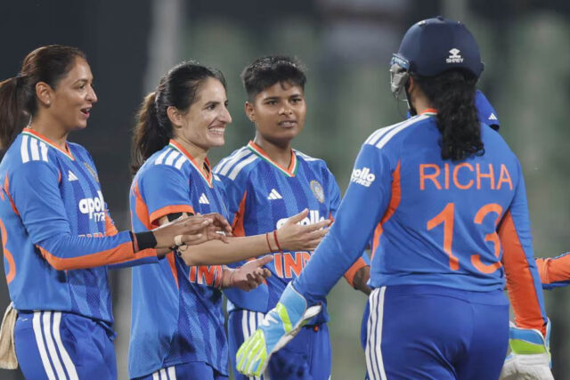 तीसरे टी20I में भारतीय महिला टीम की प्लेइंग 11: स्मृति मंधाना, शेफाली वर्मा, जेमिमा रोड्रिग्स, हरमनप्रीत कौर (कप्तान), ऋचा घोष (विकेटकीपर), दीप्ति शर्मा, अमनजोत कौर, रेणुका सिंह ठाकुर, क्रांति गौड़, वैष्णवी शर्मा और श्री चरणी.